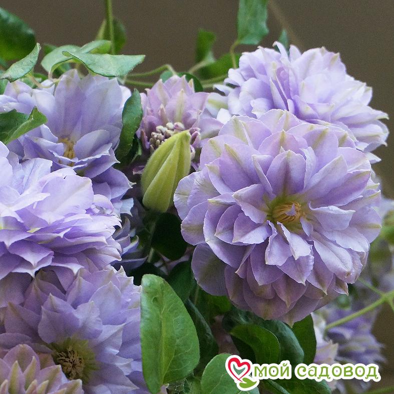 В высоту лиана достигает 1,5 – 2,5 м. Цветки махровые, диаметром до 10 см. Лепестки заостренные, окрашенные в светло-голубой цвет, с нежным фиолетовым оттенком. Тычинки белые и желтые. Растение цветет с начала мая по конец сентября. Первая волна – на прошлогодних побегах, вторая – на новых стеблях. Аромат тонкий и ненадоедливый.